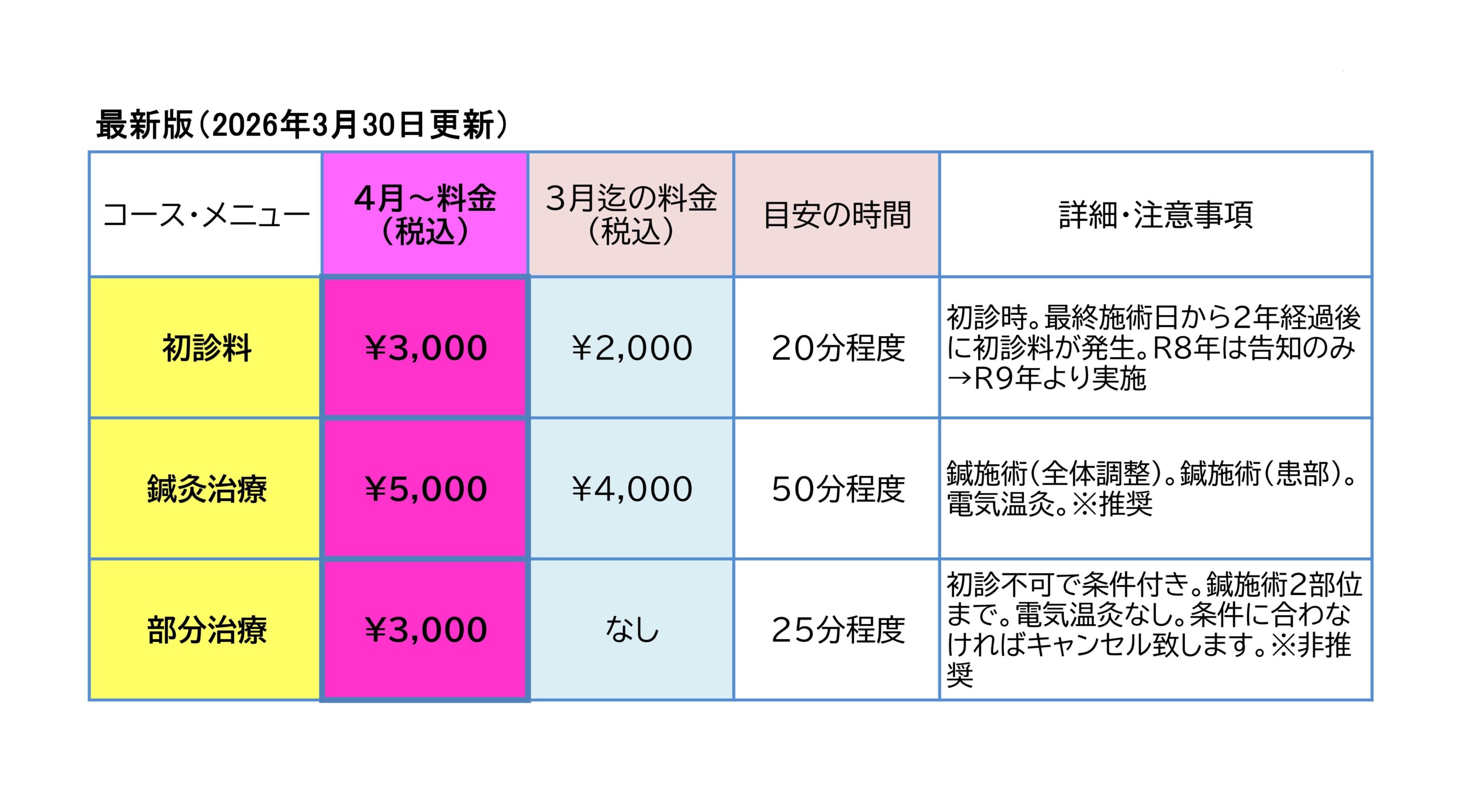 施術料金改定のお知らせ(令和8年4月~)