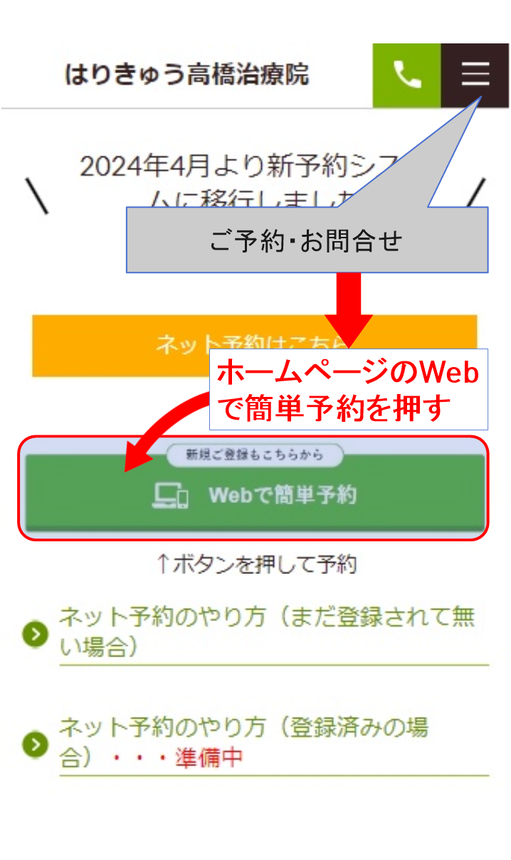 ホームページ右上の≡から【ご予約・お問合せ】を開き